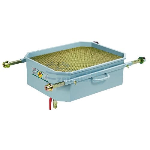 Zlewowa wanna ściekowa 65 l firmy RAASM do oleju przepracowanego z rolkami prowadzącymi, z siatką przeciwrozpryskową. Istnieje możliwość regulacji rozstawu. Wannę można opróżniać grawitacyjnie lub przy udziale pompy zewnętrznej.