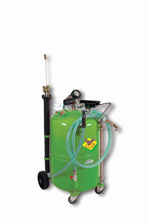 Pneumatyczna wysysarka na kółkach do oleju przepracowanego firmy RAASM, ze zbiornikiem, kompletem elastycznych i metalowych sond. Zasilana sprężonym powietrzem.