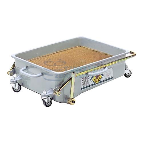 Podjazdowa wanna ściekowa 50 l na kółkach firmy RAASM do zlewania oleju przepracowanego z siatką przeciwrozpryskową. Wannę można opróżniać grawitacyjnie lub przy udziale pompy zewnętrznej.