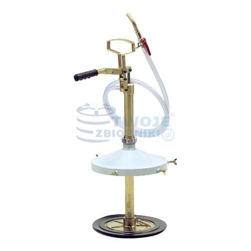 Pompa ręczna o wydajności 10 cykli dźwigni 500 g. Pompa została przystosowana do beczek o masie od 16 do 30 kg i średnicy od 260 mm do 300 mm. Zamontowano wąż o długości 2,0 m i średnicy 1/2".