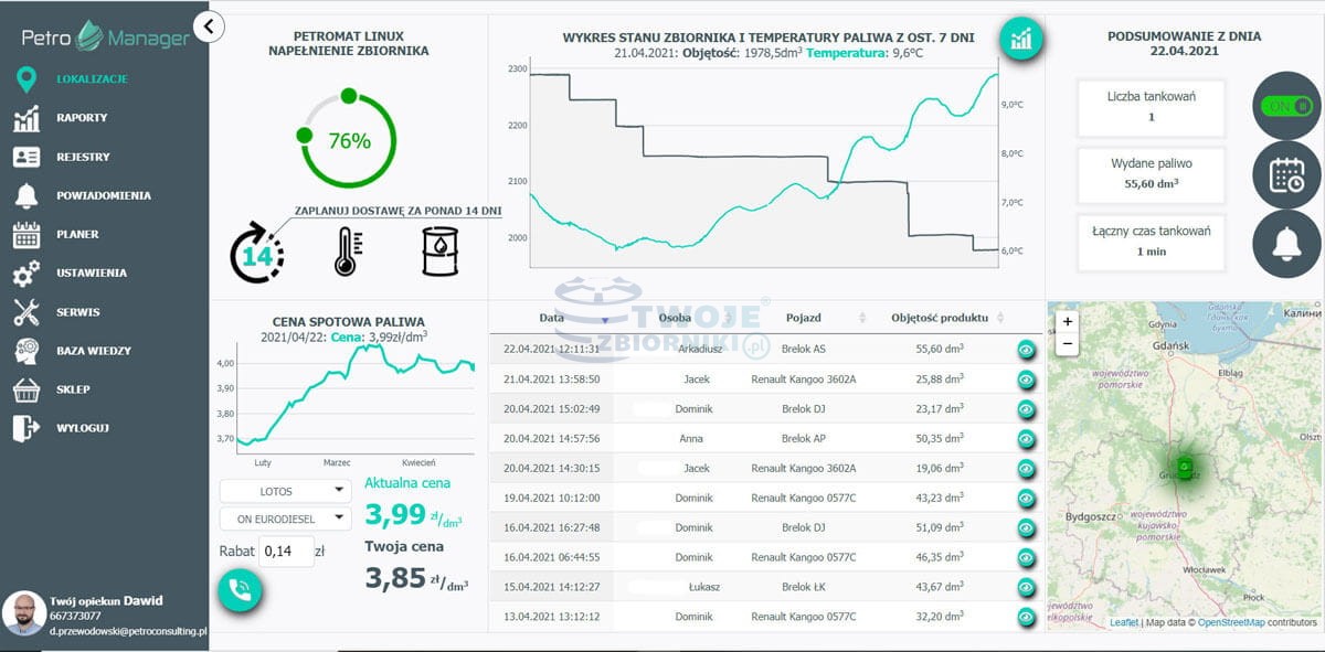 - udostępni instrukcję i DTR, podpowie jak oszczędzić na paliwie, jak przeanalizować zużycie paliwa, gdzie postawić lub zgłosić zbiornik – moduł baza wiedzy